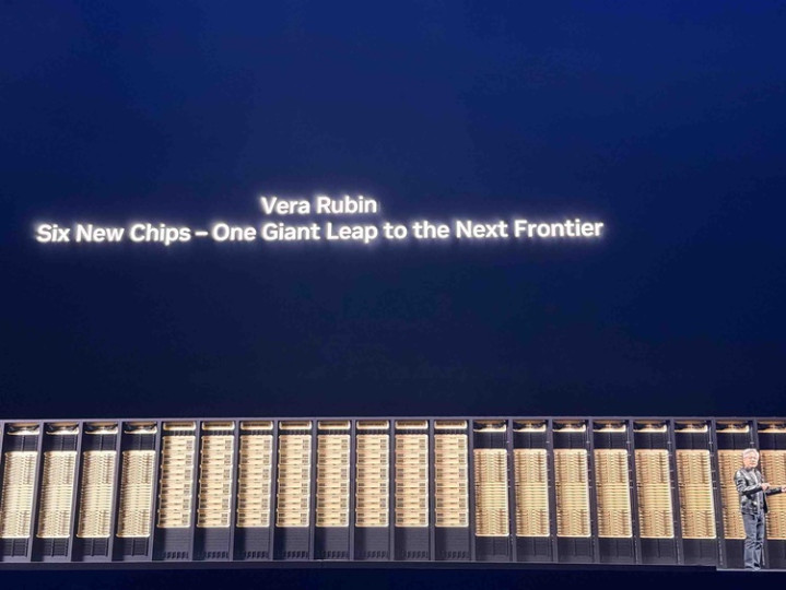 “我可以告诉你们,VeraRubin已经在全面投产了”(IcantellyouthatVeraRubinisinfullproduction),黄仁勋在舞台上宣布。这是一个全面重构的芯片架构——从CPU到GPU,到互联方式,到机柜设计,六颗芯片全部重新设计。