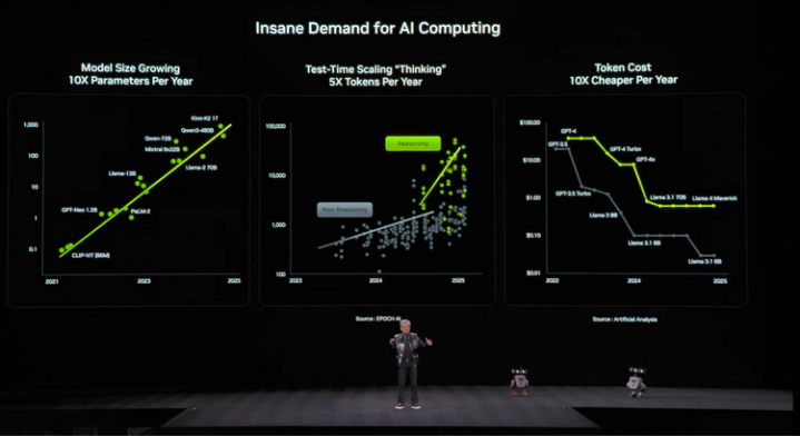 过去英伟达有一条内部准则:每代架构最多只改动1-2颗芯片。但这次,他们一口气重新设计了六颗。原因很简单,摩尔定律在放缓,但AI的需求在爆炸。模型规模每年增长10倍,生成的token数量每年增长5倍,单token成本每年下降10倍。