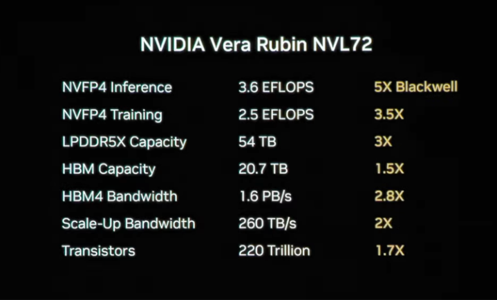 这是一个完整的机柜级计算单元:3.6EFLOPS的FP4推理算力(5倍于Blackwell),2.5EFLOPS的FP4训练算力(3.5倍),54TB的LPDDR5X容量(3倍),20.7TB的HBM容量(1.5倍),1.6PB/s的HBM4带宽(2.8倍),260TB/s的Scale-Up带宽(2倍)。整个机柜包含220万亿个晶体管。